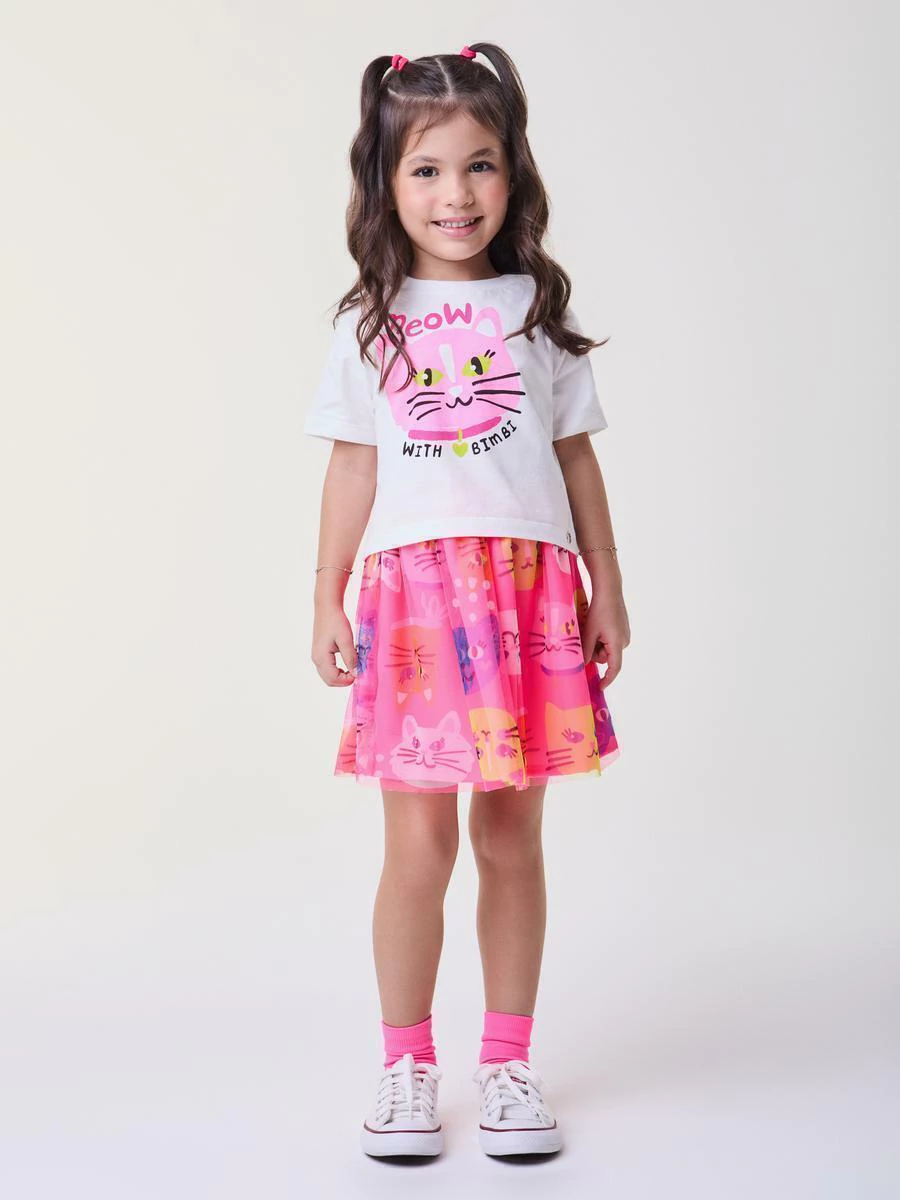 Conjunto Infantil Blusa e Saia Gatinho Neon Bimbi FA693 – Estilo e diversão para sua pequena brilhar!