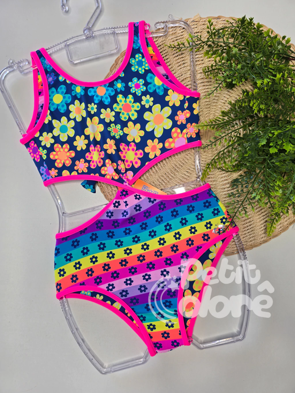 Maiô infantil Siri kids modelo Carol dupla face na estampa jardim colorido na cor de fundo preto desenhos em cores neon. Possuí proteção UV50 (malha de poliamida de altíssima qualidade). Possuí quatro opções de combinações diferentes.